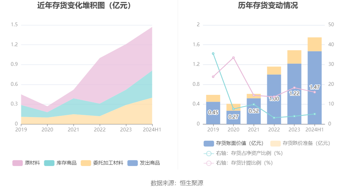 从存货变动来看,截至2024年上半年末,公司存货账面价值为1.47亿元,占净资产的5.1%,较上年末增加2575.53万元。其中,存货跌价准备为2834.75万元,计提比例为16.13%。
