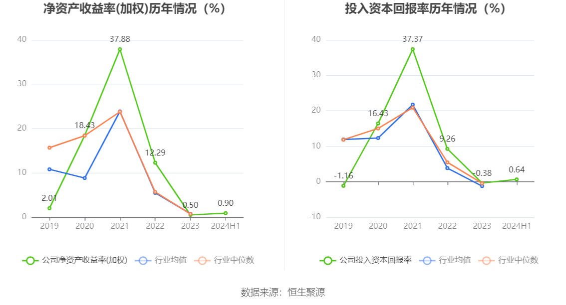数据显示,2024年上半年公司加权平均净资产收益率为0.90%,较上年同期下降0.02个百分点;公司2024年上半年投入资本回报率为0.64%,较上年同期下降0.11个百分点。