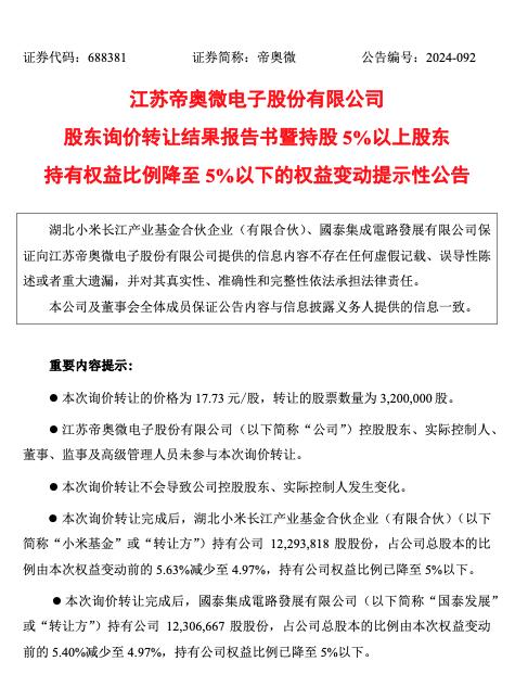 12月16日,江苏帝奥微电子股份有限公司(以下简称“帝奥微”)发布公告称,股东小米基金和国泰发展已通过询价转让方式,合计转让了320万股公司股份,占总股本的1.29%。此次转让中,小米基金出让190万股,获得约3368.7万元的转让对价,国泰发展则转让130万股,对价为2304.9万元。此次股份转让后,小米基金和国泰发展的持股比例均降至5%以下。