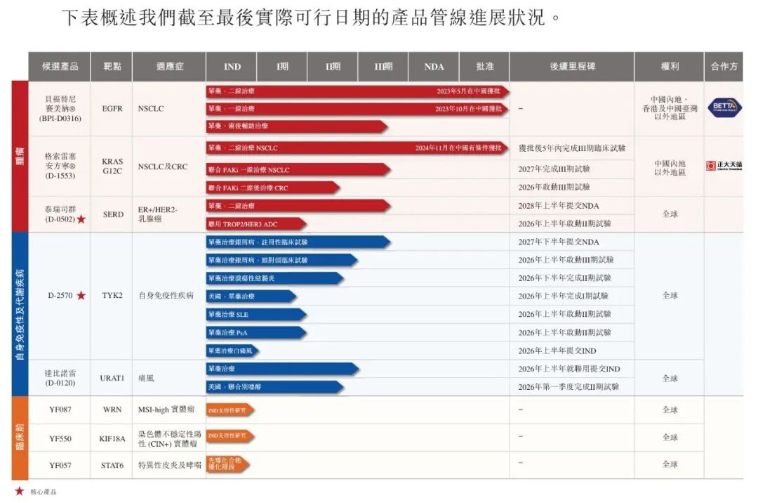 在研管线方面,公司处于临床阶段的核心药物覆盖多疾病领域:包括针对银屑病、溃疡性结肠炎等自身免疫性疾病的TYK2(酪氨酸激酶2)抑制剂D-2570、用于治疗乳腺癌的口服选择性雌激素受体降解剂泰瑞司群(D-0502)以及用于治疗高尿酸血症及痛风的URAT1(尿酸转运蛋白1)抑制剂达比诺雷。