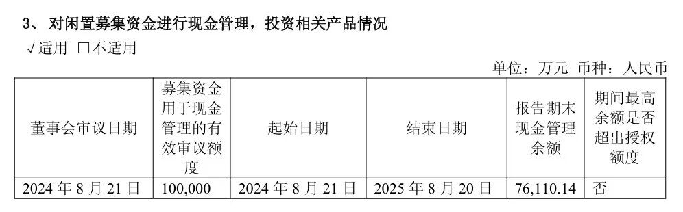 为提高闲置资金使用效率,公司于2024年8月召开董事会,审议通过《关于使用部分闲置募集资金进行现金管理的议案》,获批使用不超过10亿元的暂时闲置募集资金开展现金管理业务。根据披露数据,截至2025年6月末,公司实际投入现金管理的闲置募集资金金额约为7.61亿元。