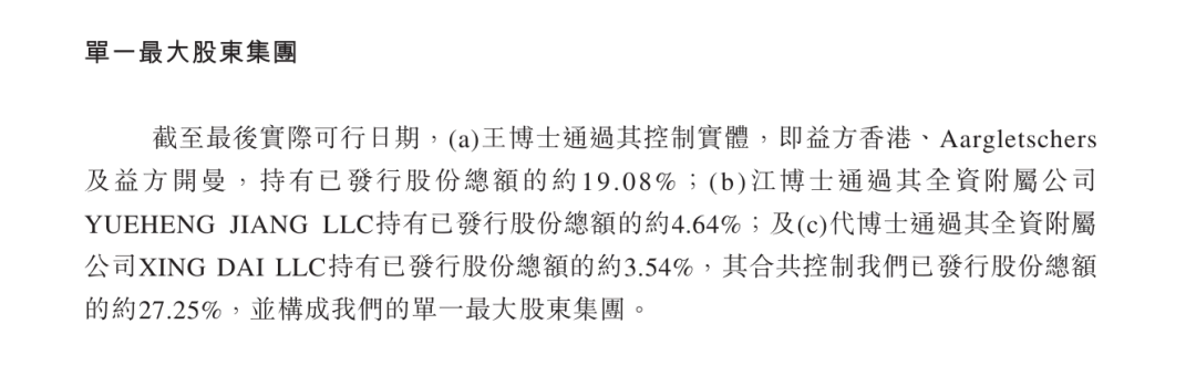 目前,王耀林通过益方香港持股约19.08%;江岳恒通过YUEHENGJIANGLLC控制益方生物4.64%股份,代星通过XINGDAILLC持股3.54%。三人合计控制益方生物约27.25%股份,为益方生物的控股股东。