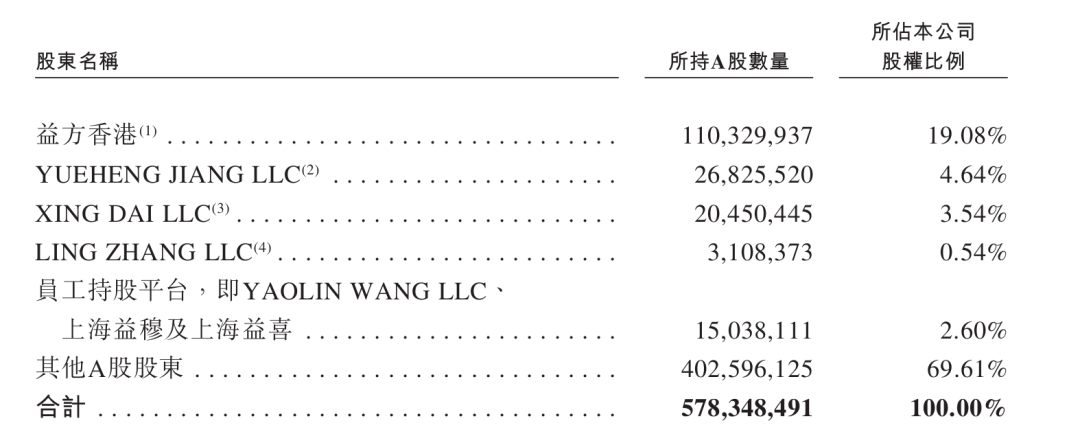 此外,员工持股平台YAOLIN WANG LLC、上海益穆及上海益喜持股2.6%,其他A股股东持股69.6%。