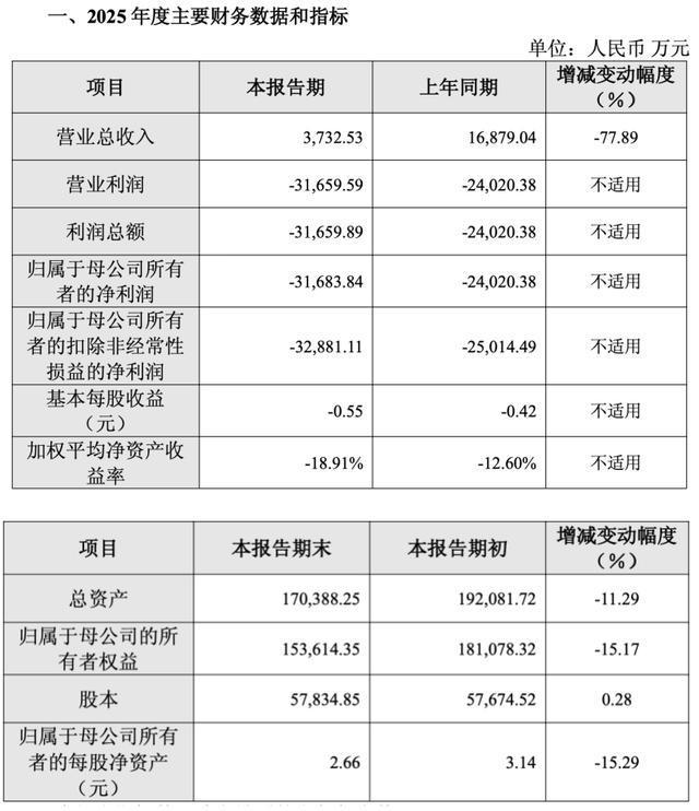 2025年,这家科创板上市的创新药企交出了一份让市场忧心的答卷。业绩快报显示,公司全年营业收入仅3732.53万元,同比骤降77.89%;归母净利润为-3.17亿元,亏损额较上年的2.4亿元进一步扩大。截至2025年末,公司总资产缩水至17.04亿元,归母所有者权益降至15.36亿元,较年初分别下滑11.29%和15.17%。
