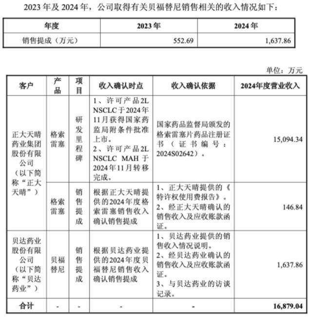 2023年,益方生物营收1.86亿元,其中贝达药业支付的1.8亿元研发里程碑款占比超过96%,销售提成仅552.69万元。2024年,营收小幅下滑至1.69亿元,收入重心转向格索雷塞的1.51亿元里程碑款,加上两款产品的销售提成合计1784.7万元。