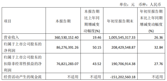 新益昌于2022年10月28日披露的2022年三季度报告显示,去年前三季度,公司实现营业收入1,005,545,317.33元,同比增长26.36%;归属于上市公司股东的净利润208,429,548.87元,同比增长32.84%;归属于上市公司股东的扣除非经常性损益的净利润190,706,914.38元,同比增长27.76%;经营活动产生的现金流量净额为-151,202,560.18元。