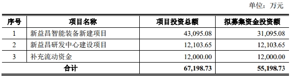 新益昌最终募集资金净额比原计划少1.10亿元。新益昌于2021年4月23日披露的招股说明书显示,公司拟募集资金5.52亿元,其中3.11亿元用于新益昌智能装备新建项目,1.21亿元用于新益昌研发中心建设项目,1.20亿元用于补充流动资金。