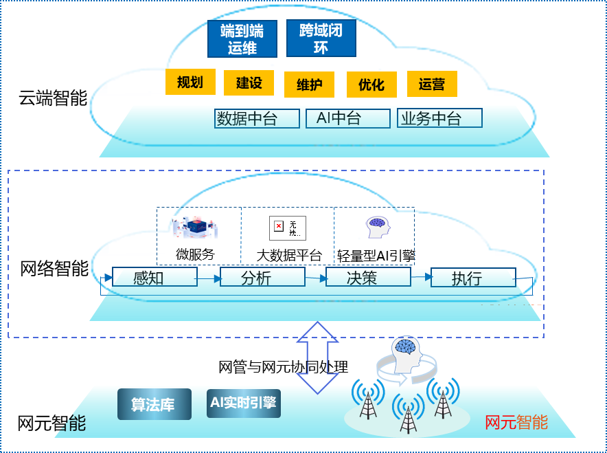 其中,云端智能基于x86云化平台,借助专家经验和全局数据转换成模型,使能跨域、整网的闭环控制,承载规建维优业务数智化。网络智能是在操作维护平台构建算法框架,向智能运维演进,进行AI小模型训练和推理,对结构化数据进行处理,实现准实时智能。网元智能是在网元设备内部,基于可获得的局部数据进行网元自身的感知分析推理,并执行预置的 AI 算法,进行网元服务范围内的自环分析决策。