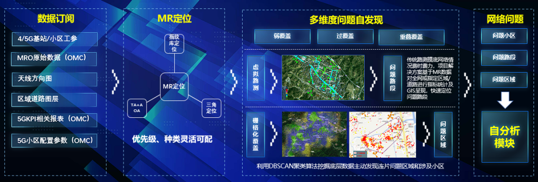 首先,通过中信科移动自智网络的创新算法, DBSCAN(基于密度聚类的异常问题区域聚类)算法实现了问题区域的自动聚类和精准判别;基于机器学习技术实现了精准定位室内外用户的能力,结合各种移动网络特征和机器学习算法,可以准确判断用户的室内外位置,并通过图像识别技术识别建筑物轮廓,进一步提高室内定位的准确性。这一算法集合能够精准发现覆盖优化中的弱覆盖、过覆盖和重叠覆盖等异常覆盖问题区域,为后续优化提供准确的基础数据。