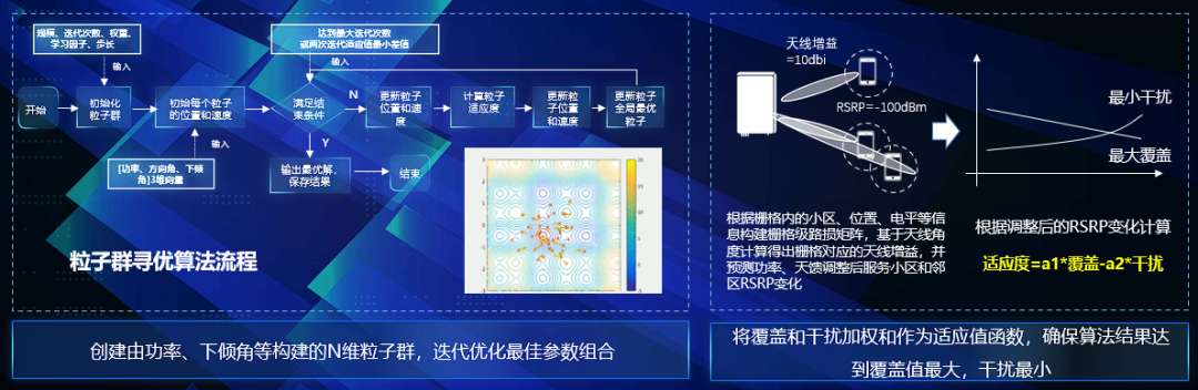 其次,中信科移动首次将智能寻优算法应用于RF优化领域,引入了机器学习最优化算法-粒子群寻优。这一算法解决了小区连片下不同天馈角度和功率区间组合过多的问题,能在短时间内选择出最优的组合方案。通过精细调整天馈角度和功率的组合,实现了对无线信号的精确控制和优化。
