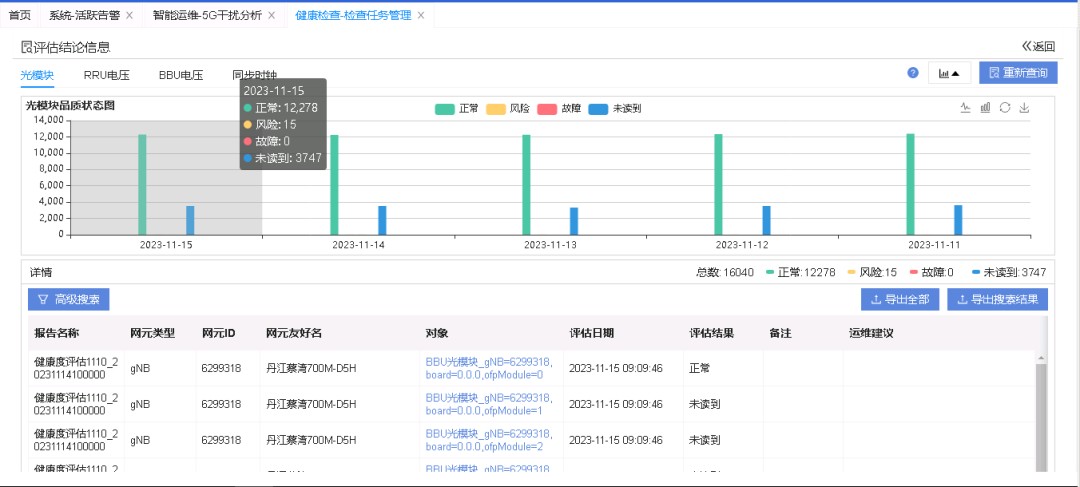 为了将设备隐患扼杀在初期,将“健康体检”理念引入到网络运维,对无线网元的关键器件进行健康度评估。通过监测关键指标的状态和变化趋势,结合AI训练模型,可对光模块、时钟源、BBU/RRU输入电压等指标实现健康度自动监控,形成关键器件的健康评分并输出检查报告,对风险器件提前预警,协助运维人员提前识别处理。经现网规模试点,故障隐患识别准确率达到90%以上,并经过上站核验,评估和实际情况相符,为主动运维提供了重要依据,提升了网络质量。