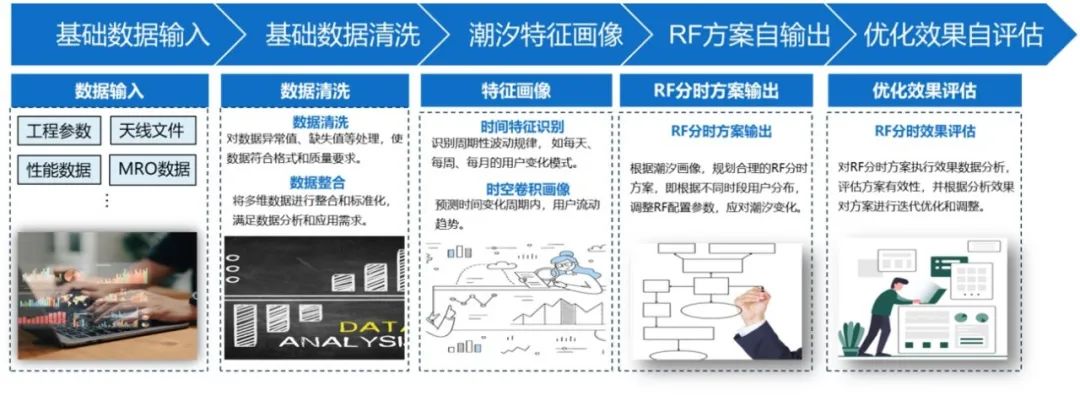 中信科移动长期以来致力于智能运维创新研究,在RF自智方向持续深耕,基于5G Massive MIMO技术结合话务潮汐典型特征场景探索研究,开发了话务潮汐小区识别TCi(Tidal Cells Insight)+RF 自智(Auto RF)联合解决方案,旨在实现网络的分时自适应优化,提高网络质量与效率。该方案对接现网多维度数据,从基础数据清洗、潮汐特征画像、RF方案自输出、优化效果自评估4个维度着力,深度结合AI技术,实现对话务潮汐场景的精准识别与快速响应。