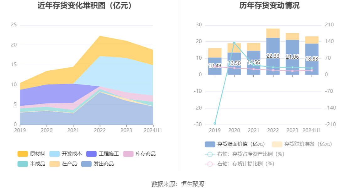 从存货变动来看,截至2024年上半年末,公司存货账面价值为18.83亿元,占净资产的29.09%,较上年末减少2.23亿元。其中,存货跌价准备为4.39亿元,计提比例为18.9%。