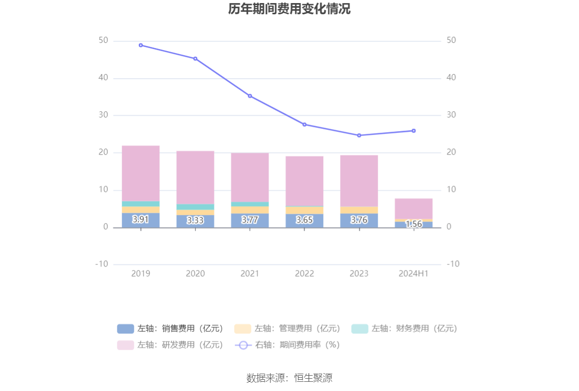 2024年上半年,公司期间费用为7.76亿元,较上年同期减少7860.05万元;但期间费用率为25.92%,较上年同期上升1.13个百分点。其中,销售费用同比下降11.4%,管理费用同比下降11.13%,研发费用同比下降9.84%,财务费用由去年同期的-1141.84万元变为-108.75万元。