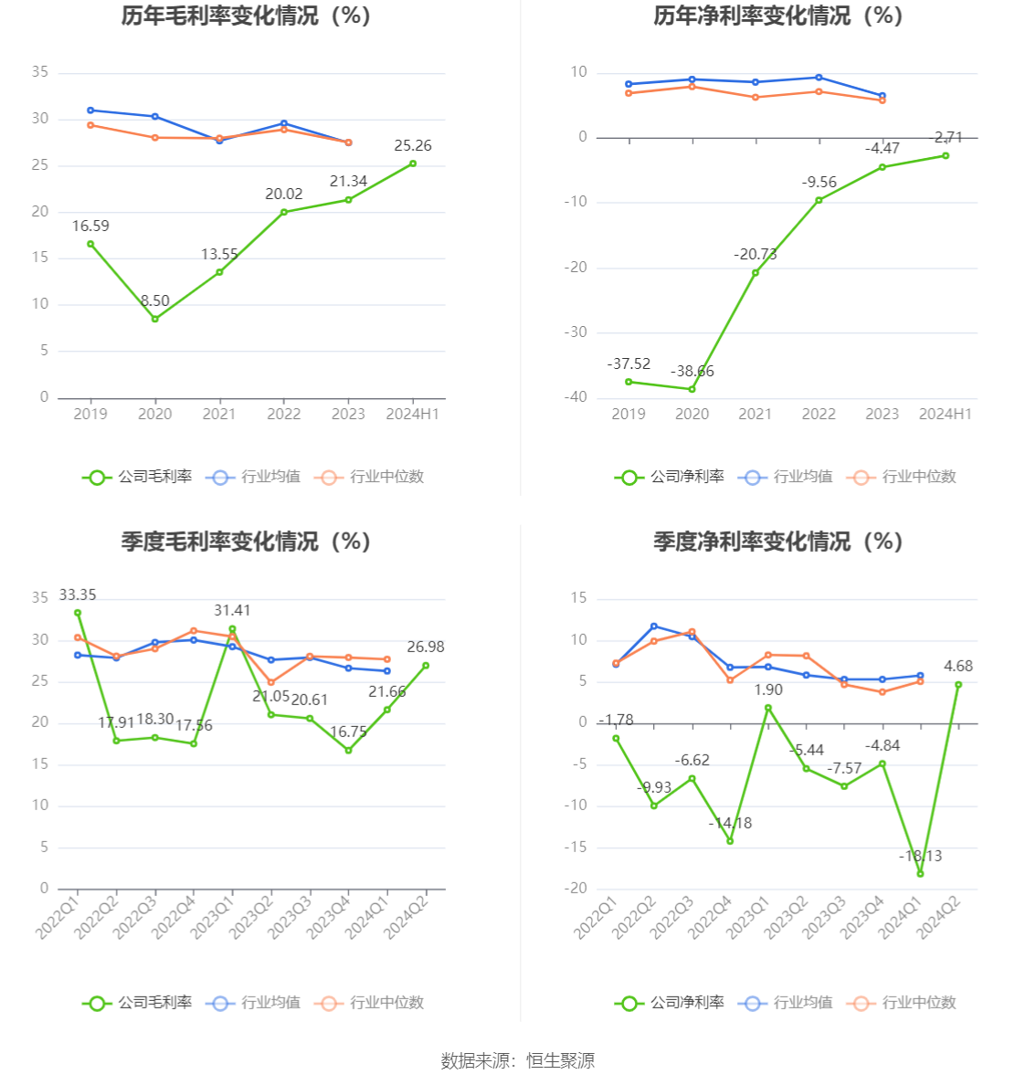 2024年上半年,公司毛利率为25.26%,同比上升0.13个百分点;净利率为-2.71%,较上年同期下降0.17个百分点。从单季度指标来看,2024年第二季度公司毛利率为26.98%,同比上升5.93个百分点,环比上升5.32个百分点;净利率为4.68%,较上年同期上升10.12个百分点,较上一季度上升22.81个百分点。