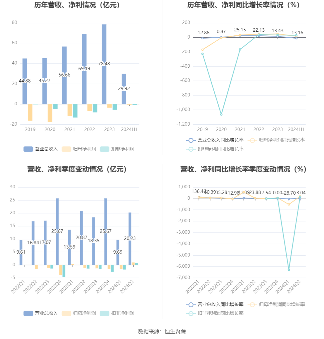 2024年上半年,公司经营活动现金流净额为-10.70亿元,同比增加1.60亿元;筹资活动现金流净额1.43亿元,同比增加4215.98万元;投资活动现金流净额-5.53亿元,上年同期为11.77亿元。
