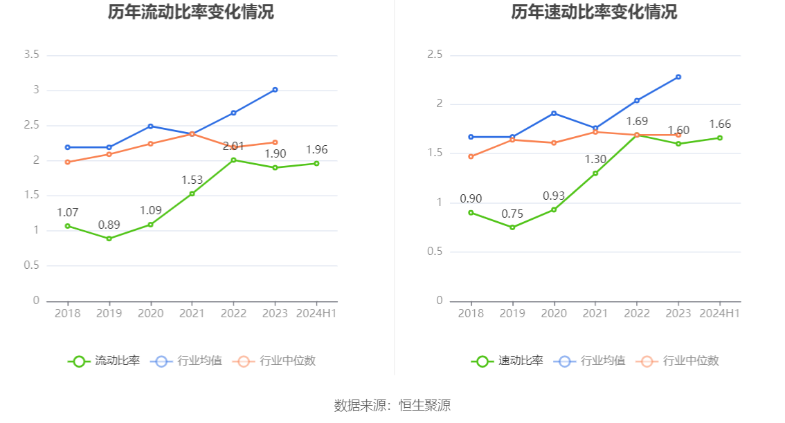 2024年上半年,公司流动比率为1.96,速动比率为1.66。