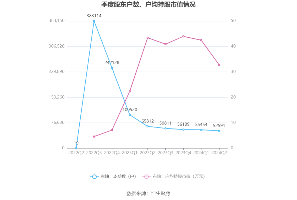筹码集中度方面,截至2024年上半年末,公司股东总户数为5.26万户,较一季度末下降了2863户,降幅5.16%;户均持股市值由一季度末的42.42万元下降至32.76万元,降幅为22.77%。