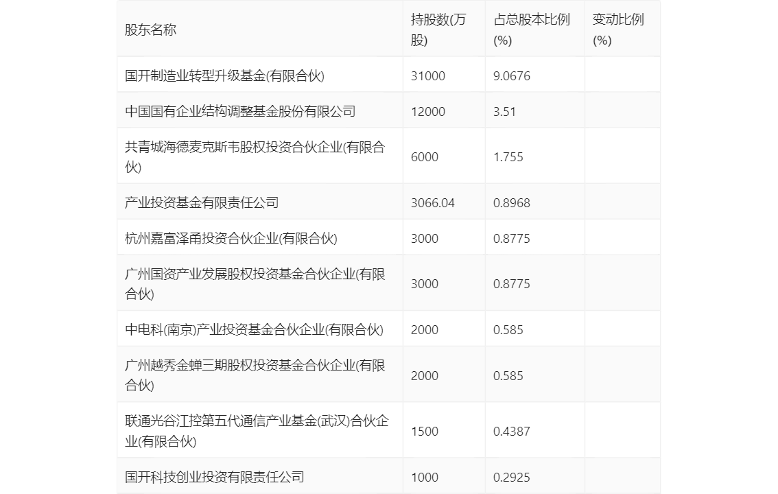 半年报显示,2024年上半年末公司十大流通股东中,新进股东为国开制造业转型升级基金(有限合伙)、中国国有企业结构调整基金股份有限公司、共青城海德麦克斯韦股权投资合伙企业(有限合伙)、杭州嘉富泽甬投资合伙企业(有限合伙)、广州国资产业发展股权投资基金合伙企业(有限合伙)、中电科(南京)产业投资基金合伙企业(有限合伙)、广州越秀金蝉三期股权投资基金合伙企业(有限合伙)、联通光谷江控第五代通信产业基金(武汉)合伙企业(有限合伙)、国开科技创业投资有限责任公司,取代了一季度末的武汉科技投资有限公司、武汉光谷新技术产业投资有限公司、武汉城建资本运营有限公司、中证500交易型开放式指数证券投资基金、兖矿资本管理有限公司、申万宏源信科移动员工参与科创板战略配售1号集合资产管理计划、博时上证科创板100交易型开放式指数证券投资基金、香港中央结算有限公司、张永平。在具体持股比例上,产业投资基金有限责任公司持股有所下降。