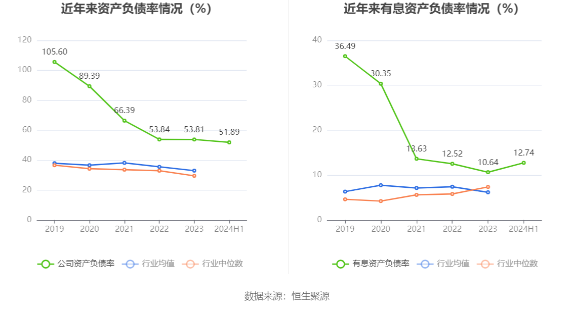 在偿债能力方面,公司2024年上半年末资产负债率为51.89%,相比上年末下降1.92个百分点;有息资产负债率为12.74%,相比上年末上升2.10个百分点。