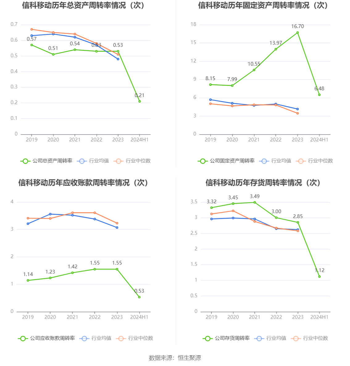营运能力方面,2024年上半年,公司公司总资产周转率为0.21次,上年同期为0.23次(2023年上半年行业平均值为0.22次,公司位居同行业18/37);固定资产周转率为6.48次,上年同期为7.24次(2023年上半年行业平均值为2.01次,公司位居同行业3/37);公司应收账款周转率、存货周转率分别为0.53次、1.12次。