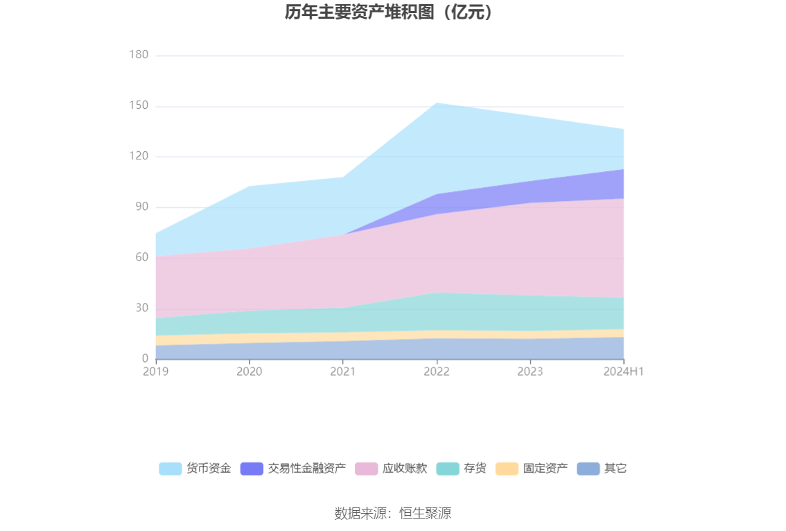 资产重大变化方面,截至2024年上半年末,公司货币资金较上年末减少38.61%,占公司总资产比重下降9.38个百分点;应收账款较上年末增加6.74%,占公司总资产比重上升4.89个百分点;交易性金融资产较上年末增加34.60%,占公司总资产比重上升3.82个百分点;存货较上年末减少10.57%,占公司总资产比重下降0.79个百分点。