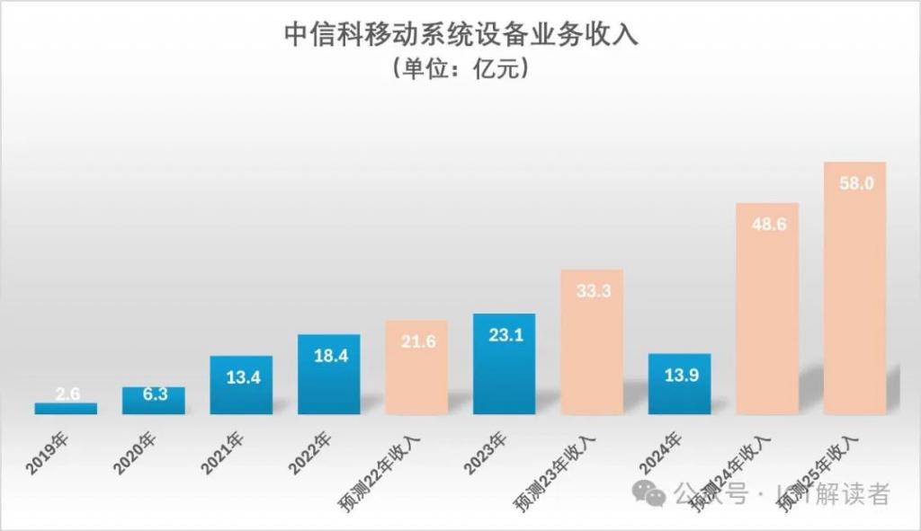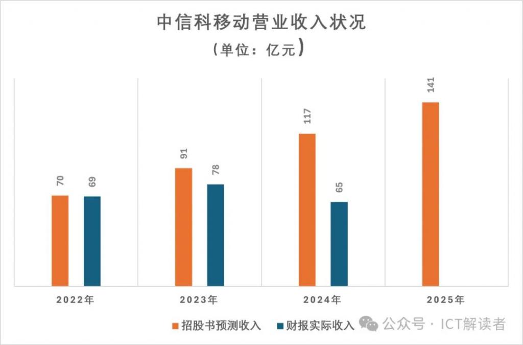 然而回头来看,除了上市当年中信科移动的营收同比增长了 22%,达到预测收入水平之外,2023 年的营收同比仅增长 13%,与预测收入水平少了 13 亿;到 2024 年竟然迎来了营收下滑 17%,堪堪只有预测收入的半数水平了。