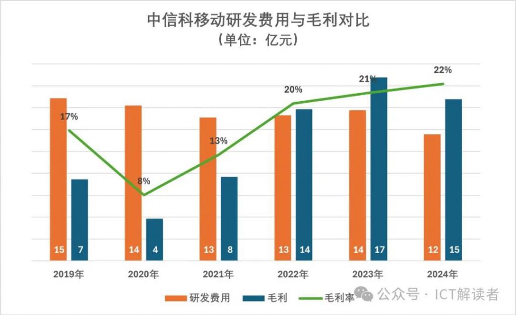 而高额的研发投入,于中信科移动而言无疑是填不饱的吞金兽,从其历年的研发费用与毛利对比来看,虽然其毛利水平已经从 2019 年的 7 亿翻倍到了 2024 年的 15 亿,但也就是与研发投入堪堪持平而已,再扣除销售费用、管理费用、财务费用等其他支出,中信科移动迟迟未能盈利实属必然。