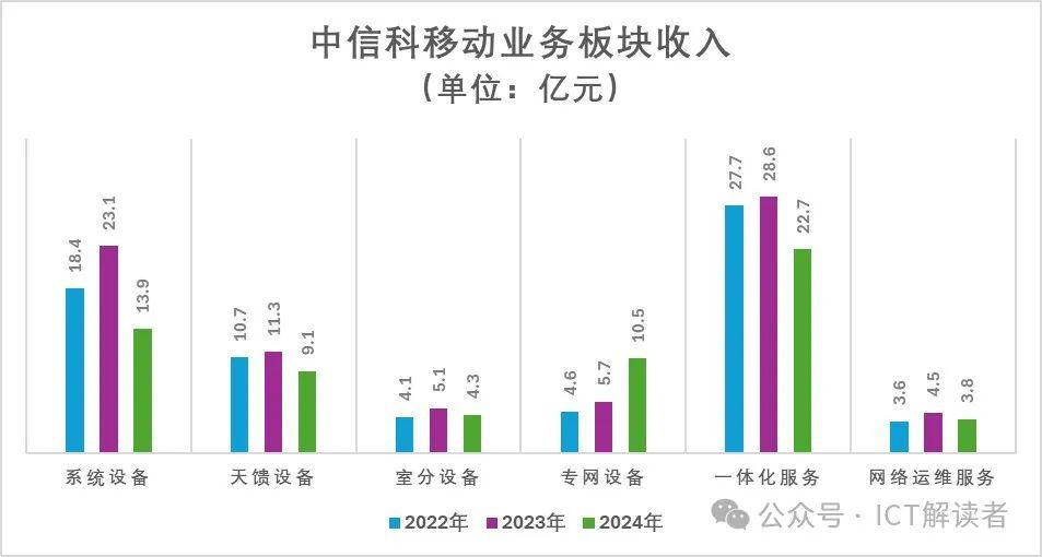 从中信科移动 2024 年的业务表现来看,除了行业专网设备业务营收同比大增外,天馈设备、室分设备、一体化服务和运维服务业务均下滑了 20%左右,而作为公司核心业务的 4/5G 移动通信系统设备业务竟然同比下滑了 40%,营收规模已不足 14 亿。