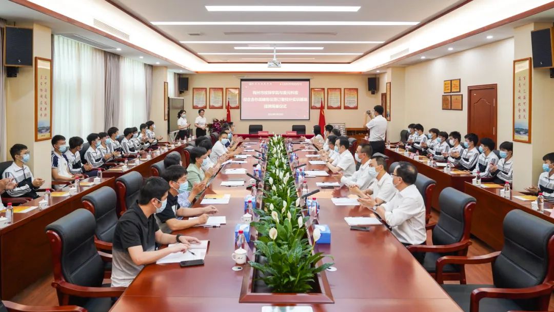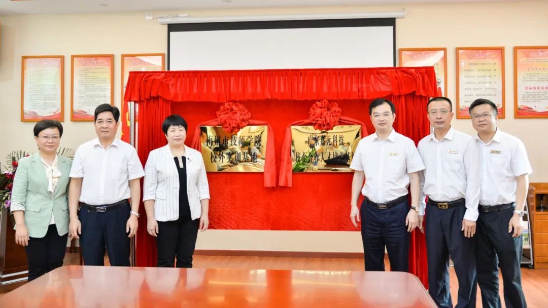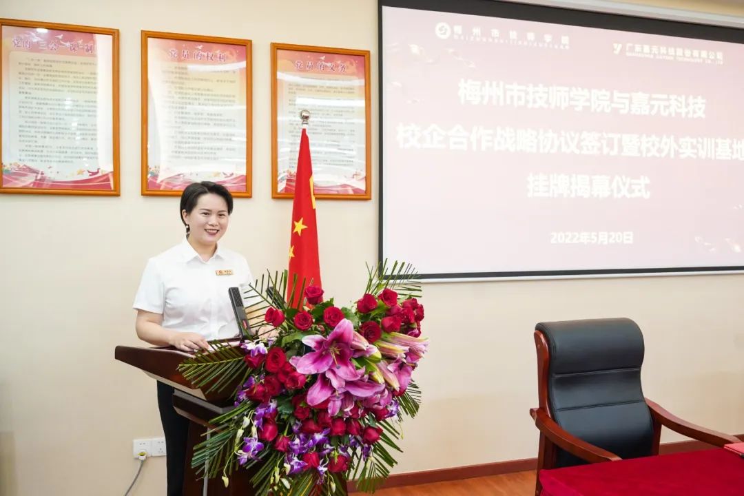随后,当值总裁叶铭与梅州市技师学院院长曾利兰分别代表双方签订校企合作战略协议,与会领导一同为“梅州市技师学院校外实训基地”和“广东嘉元科技校企合作人才培养基地”挂牌揭幕。