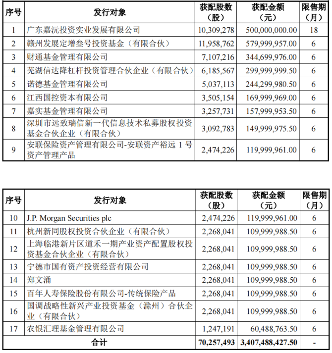 2022年10月18日晚间,嘉元科技(688388.SH)发布了2021年度向特定对象发行股票发行情况报告书。内容显示,此次向特定对象发行股票的实际发行数量为7025.75万股,发行价格为48.50元/股,募集资金总额约为34.075亿元。此次发行对象最终确定为17家,涵盖多家公募基金。