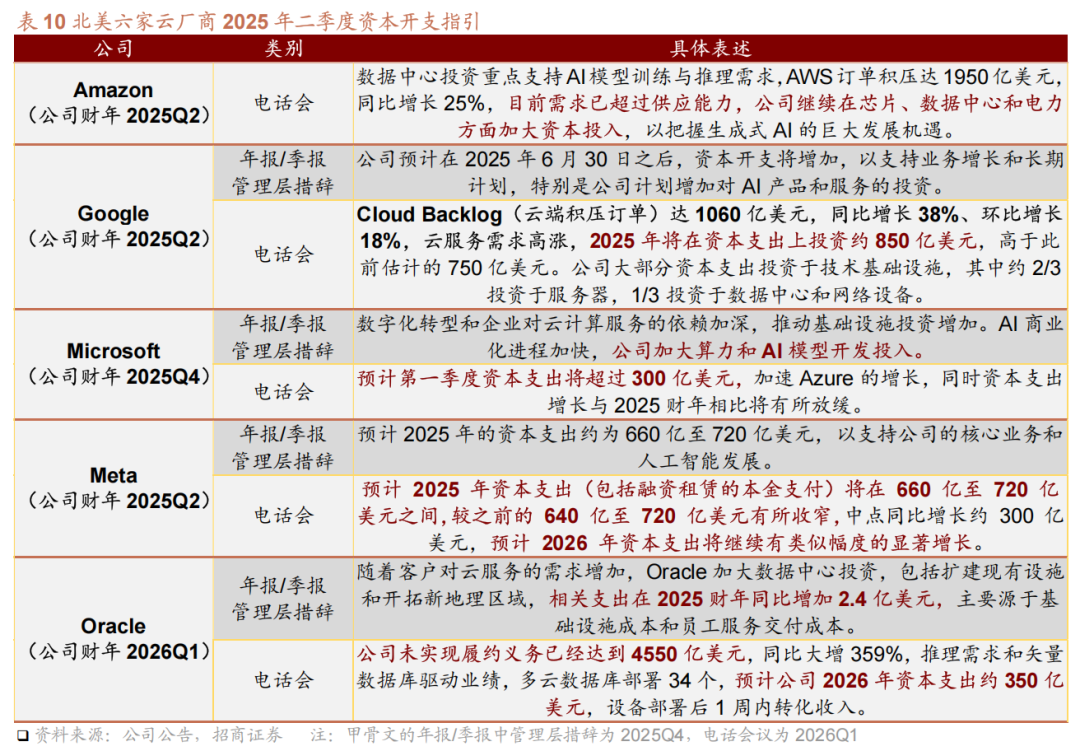 算力需求激增拉动云厂商资本开支快速增长,2025年二季度多家云厂商进一步上修资本开支指引,数据中心的快速扩张促使光模块保持高景气度具有长期确定性。2025年上半年,以亚马逊、微软、谷歌、Meta、甲骨文和Cisco为代表的北美云厂商实际资本开支达1755.6亿美元,同比增长72%,同时,以百度、腾讯和阿里巴巴为代表的中国互联网企业资本开支合计164.7亿美元,同比增长138%。随着人工智能发展的需求提升,多家云厂商上修资本开支指引,其中,2025年9月甲骨文宣布公司未实现履约义务达4550亿美元,全年资本开支预计达350亿美元,算力基础设施产业蓬勃发展促使光模块保持旺盛需求。
