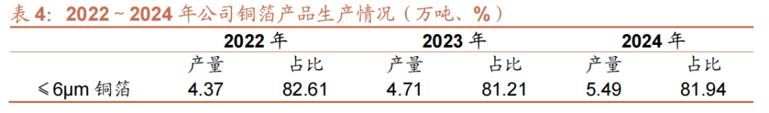 产能利用率较高。公司作为国内高性能电解铜箔行业领先企业之一,以厚度低于6μm的极薄锂电铜箔作为主要产品,产品结构相对稳定,≤6μm铜箔的产销量在2022-2024年占比都在80%以上。公司产销率较高,2022-2024年分别为92.63%、99.48%、101.04%,销售情况良好。