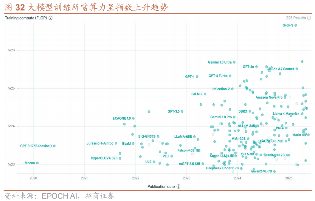 近年来,AI大模型的成熟应用带动推理侧和训练侧的算力需求激增。以GPT系列模型为例,推理侧,大模型训练算力在五年内增长超3个数量级。2020年5月发布的GPT-3,所需训练算力约3.1 x 1011 TFLOPs;2022年11月发布的GPT-3.5,训练算力跃升至2.6 x 1012 TFLOPs,增长近8.4倍;2024年5月发布的GPT-4o,消耗了3.8 x 1013 TFLOPs的训练算力,相较于GPT-3.5增长了约14.6倍。训练侧,用户需求急剧扩张催生大量推理侧算力需求。ChatGPT自推出以来用户数持续快速增加,2025年2月周活跃用户数已达到约4亿人,2025年4月OpenAI CEO奥特曼在TED 2025大会披露,ChatGPT用户在数周内翻了一番,达到近8亿人的使用规模。