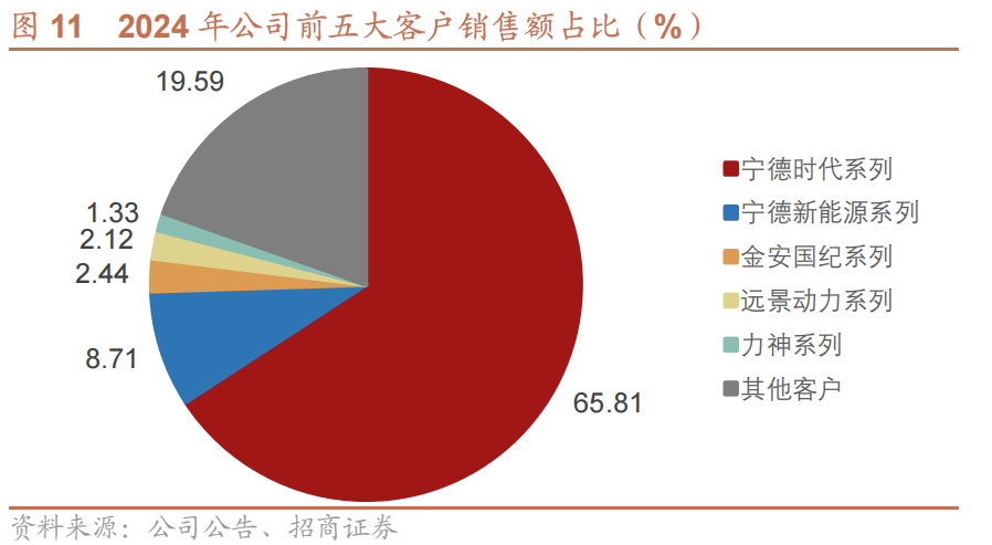 与宁德时代等头部企业紧密合作。公司与宁德时代、宁德新能源、比亚迪等知名电池厂商建立了长期合作关系,并成为其锂电铜箔的核心供应商。2024年,公司最主要的客户为宁德时代系列(宁德时代及其关联公司合并口径),占总销售收入的65.81%;其次为宁德新能源系列,占总销售收入的8.71%。