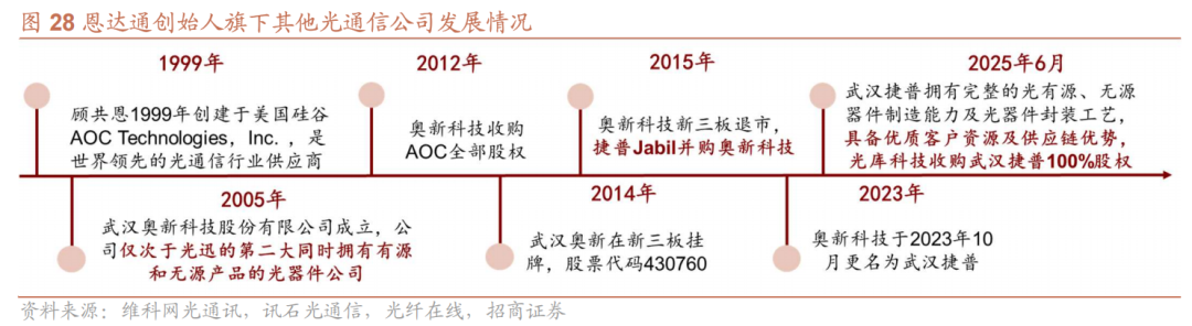 恩达通的创始人为光迅科技的自然股东,顾博士旗下创设多家光通信企业深耕海外市场。2001年,顾共恩博士与武汉邮科院合作创立光迅科技,是光迅科技唯一的自然人股东,同时也是光迅科技早期北美市场的开拓者,主要代理光迅科技的产品销售。此外,1999年,顾博士在美国硅谷创立了AOC科技公司,2005年在武汉创立了奥新科技公司,奥新科技当时是仅次于光迅科技的第二大做有源和无源光器件产品的公司,公司在意大利、泰国等设立海外子公司及生产基地,2025年6月,武汉捷普在经历多轮资产重组后最终被光库科技收购,与光库科技现有产品形成互补。