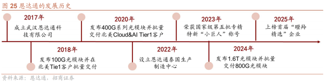 恩达通采用自主研发体系,具备800G光模块批量生产能力,2023年荣获国家级第五批专精特新“小巨人”,2025年上榜首届“瞪羚精选”企业。
