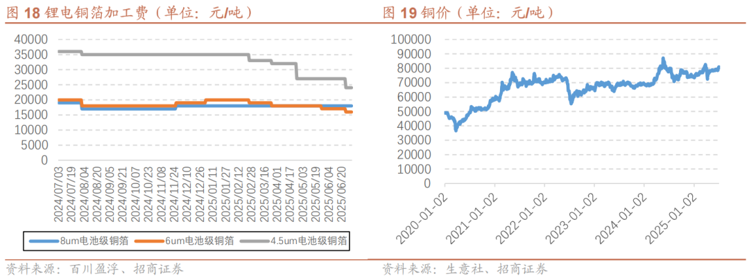 锂电铜箔行业的盈利情况开始复苏。锂电铜箔行业总体仍然相对过剩,其中,中低端铜箔加工费低位震荡,但高端铜箔技术、客户壁垒相对较高,供需态势相对有序。经历2024年全行业亏损后,2025年开始迎来温和复苏,从铜箔加工费来看,偏高端的产品加工费开始有所提价,从经营结果来看,几家头部企业通过降本增效和产品高端化开始扭亏。