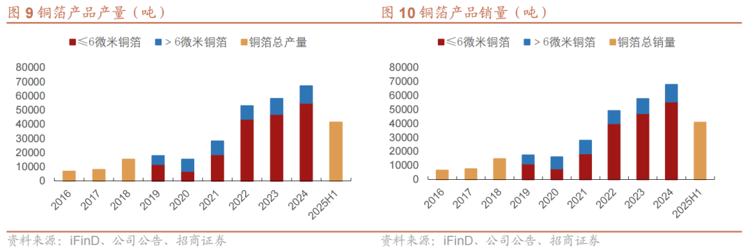 公司铜箔产能迅速扩张,产销量快速增长。产量从2021年的2.78万吨增至2024年的6.77万吨,2025H1产量达4.14万吨,同比+ 72.46%;销量从2021年的2.81万吨增至2024年的6.70万吨,2025H1销量达4.07万吨,同比+ 63.01%。