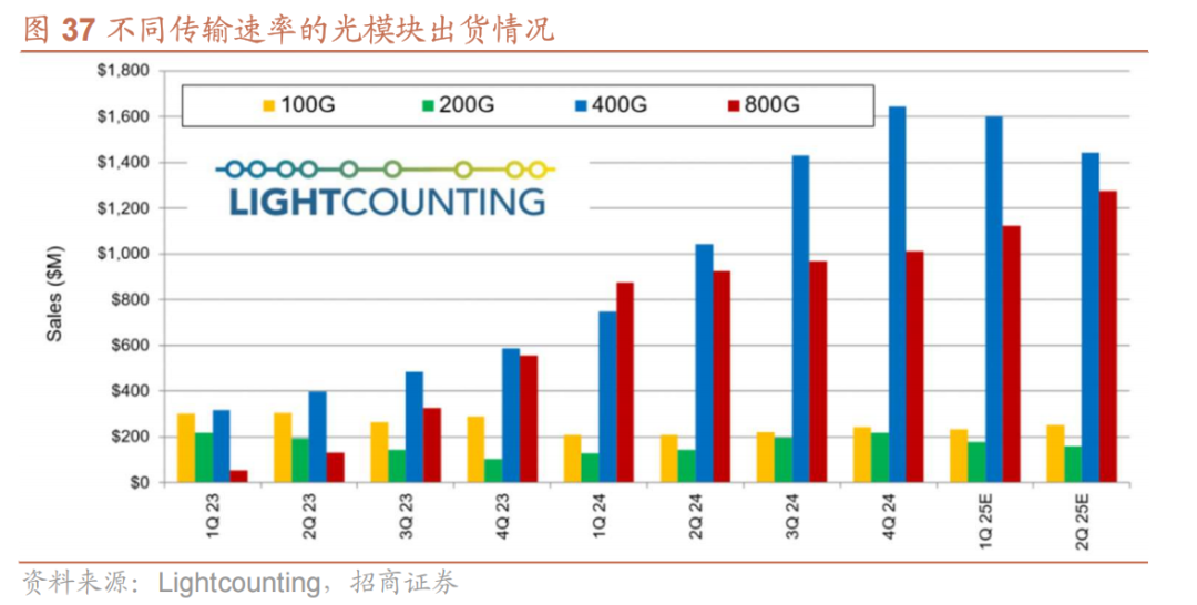 800G与1.6T的光模块将成为数据中心的主流产品。在数据流量指数级增长的背景下,对于光模块的数据传输速率和容量要求陡增,以800G为代表的光模块逐渐成为AI数据中心的主流选择。根据LightCounting,2025年第二季度,全球光模块的销售额环比增长10%,主要来自800G光模块的贡献,随着亚马逊和Meta等云计算巨头向更高速光模块过渡,400G光模块的销售将逐渐下降。