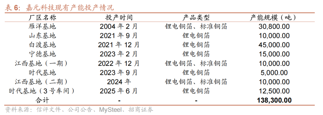 现有产能充足,未来产能有增长空间。截至2025H1,公司已建成铜箔产能达到13万吨/年以上,在建工程中包括在安装设备和时代基地年10万吨高性能电解铜箔建设项目。时代基地总规划产能10万吨/年,全部建成后总体规划产能将达到20万吨/年以上。目前,嘉元科技具有充足的产能储备,可快速响应市场需求,及时承接市场增量订单。