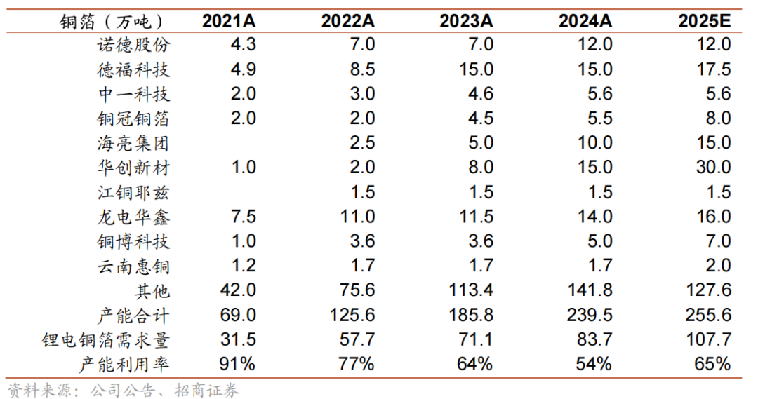 新增产能扩张虽边际放缓,但绝对增量仍远超需求,行业依旧过剩。根据我们的产能统计及企业资本开支数据,2023-2025年国内铜箔产能增速分别为48%、29%、7%,显著放缓,但产能绝对增量仍显著高于下游需求。特别是结构性矛盾突出,新增产能中低端产品占比过高,而高端铜箔(如≤4.5μm极薄铜箔)实际有效供给不足,进一步加剧低端市场过剩。