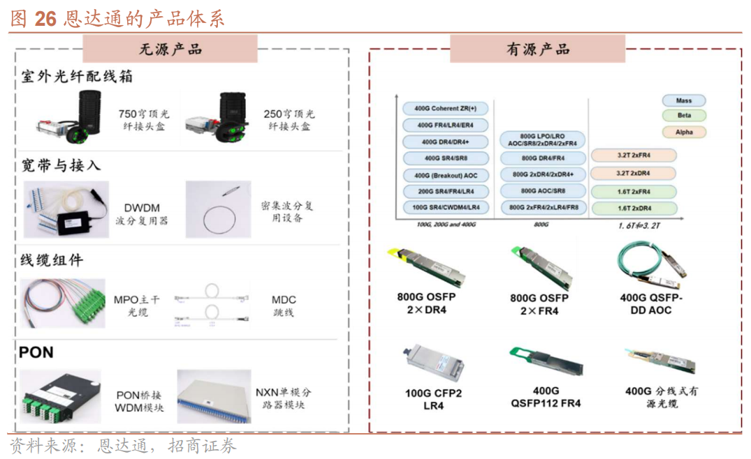 恩达通是国内领先的光模块制造企业。武汉恩达通科技有限公司(以下简称“恩达通”)成立于2017年,主要从事光通信领域光电子器件研发、生产、销售,公司产品包括高速光模块、有源器件、无源器件等,被广泛应用于数据中心、AI算力中心的光互联等。