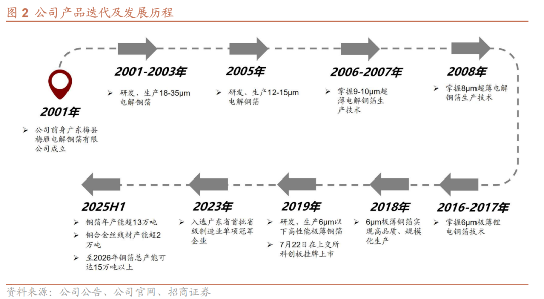 公司2019年7月在科创板上市,上市以来,公司持续投入铜箔产品的研发和生产,截至2025年共有铜箔产能超过13万吨,铜合金丝线材产能超2万吨,预计2026年铜箔总产能可达15万吨以上,产能规模与市占率均居行业前列。