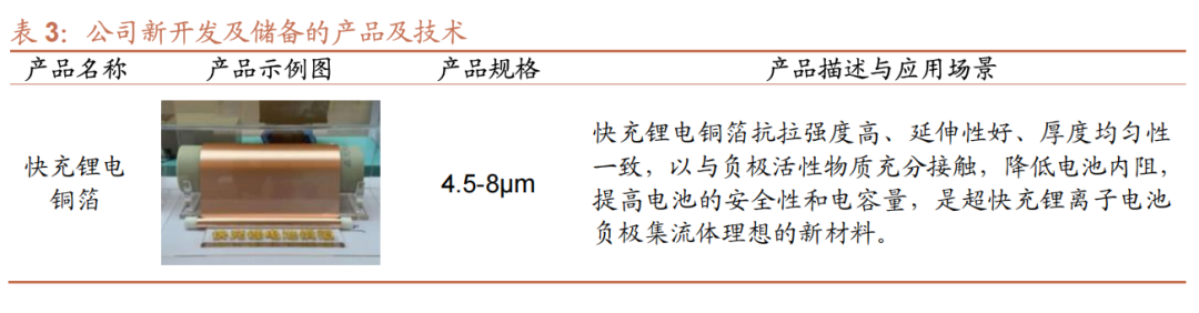 引领行业的产品迭代。公司开展了高强/超高/特高强锂电铜箔、微孔铜箔、单晶铜箔、高阶RTF铜箔、 HVLP铜箔、复合铜箔、IC封装极薄铜箔、高精密裸铜线、镀锡线、绞线等新产品研发,新型特种铜箔等前沿新技术研发,并时刻关注电池技术路线的发展变化,开展包括但不限于固态电池、硅基负极电池和低空经济等所需新型负极集流体产品的相关研究及送样工作,其中全固态及半固态电池所用铜箔已小批量供应,高强/超高强/特高强锂电铜箔和PCB用超薄铜箔(UTF)已批量生产。