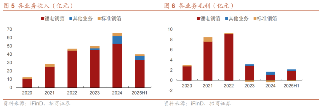 锂电铜箔为绝对主业。分业务来看,2025H1公司总收入39.63亿元,其中锂电铜箔收入33.2亿元,其他业务收入5.01亿元,标准铜箔收入1.42亿元,分别占比83.8%、12.6%、3.6%。2025H1,公司销售毛利为2.01亿元,其中锂电铜箔贡献1.88亿元,其他业务贡献0.22亿元,标准铜箔毛利为-0.09亿元。