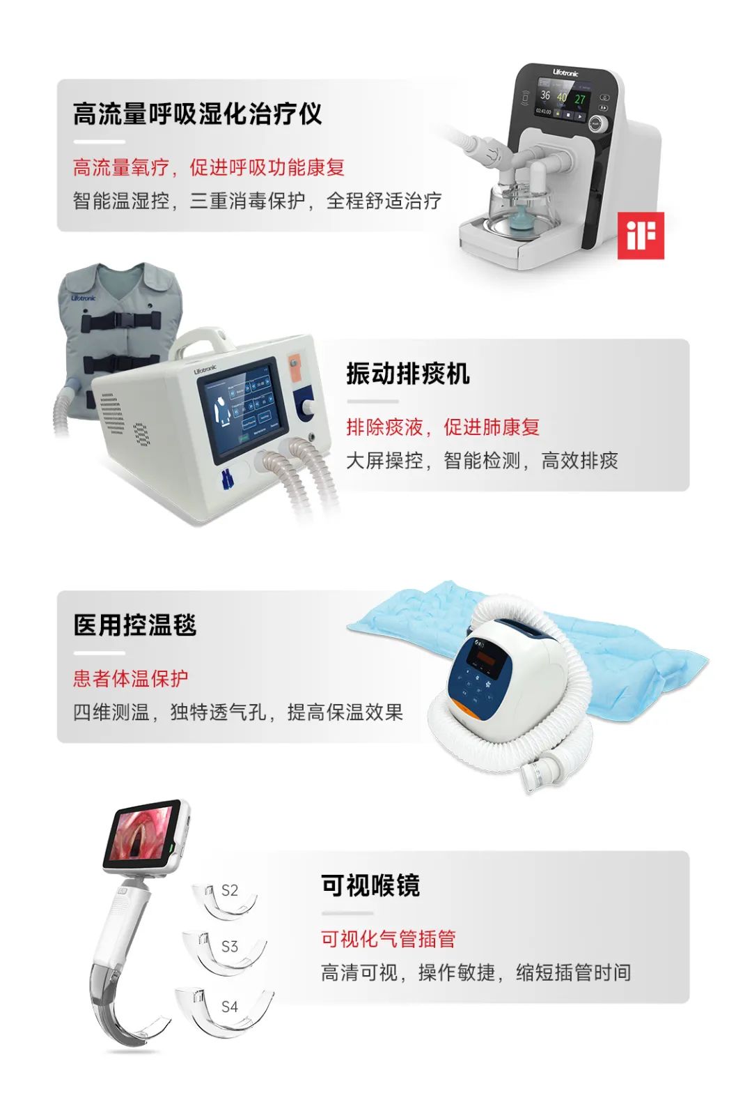 普门科技针对县级综合医院呼吸内科、麻醉科、胸外科、心脏大血管外科、急诊医学科、重症医学科等各个科室的设备配置标准,推出了一整套呼麻重症整体解决方案,涵盖高流量呼吸湿化治疗仪、振动排痰机、医用控温毯、可视喉镜等设备,为实现县级综合医院服务能力提供保障。