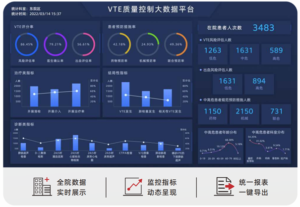 智慧化VTE防控系统无缝对接HIS系统、病历系统、护理系统,获取有关VTE疾病的碎片化数据,完成全院住院患者评估、中高危患者筛查、质控管理,帮助临床医生、医务管理人员搭建院内VTE预防信息化体系建设。