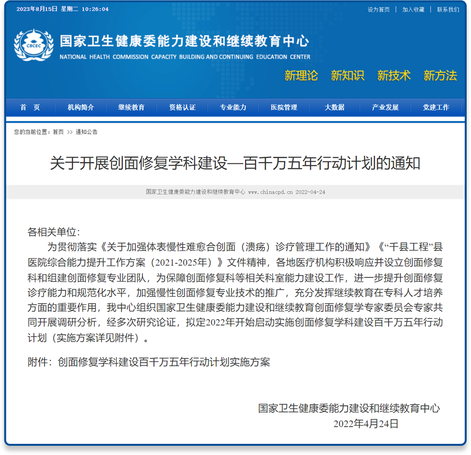 在中国,各种复杂难愈合创面发病率高、发病机制复杂、治疗难度大、治疗费用负担重,这些问题对人民群众的健康造成了重大影响,因此必须建立新的治疗体系来应对。国家卫健委能力建设和继续教育中心发布了“关于开展创面修复学科建设-百千万五年行动计划”通知,提出五年内建设千家县级医院创面修复科(组),“县级综合医院设备配置标准”中明确规定了县级医院神经内科、急诊科及烧伤科需配备的相关仪器设备,系列政策为创面修复学科建设指明了方向。