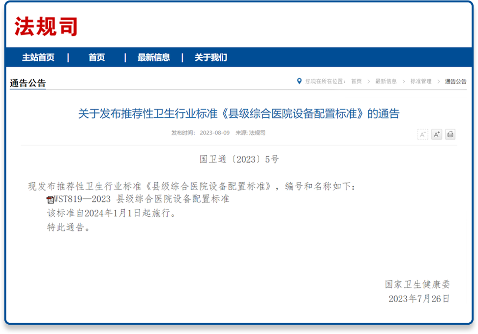近日,国家卫健委正式发布《县级综合医院设备配置标准》(WS/T 819—2023),规定了对县级综合医院万元以上设备配置的基本原则,该标准自2024年1月1日起施行。